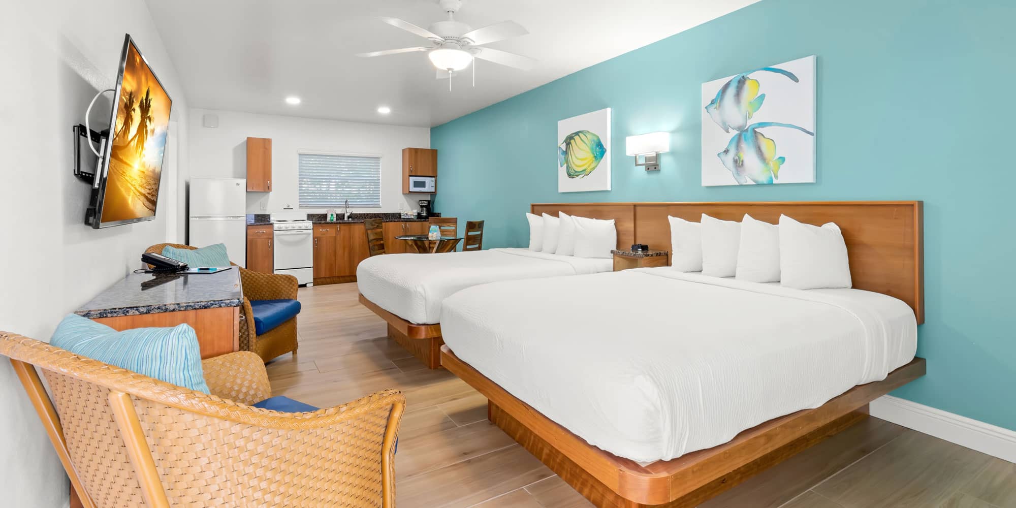 Our Deluxe Efficiency Units are perfect for families who want more space than the Efficiency Units offer during their beach vacation. Thoughtfully designed with additional living space, these all-in-one units feature a spacious kitchen and a dining area. This gives you everything you need to prepare meals or reheat leftovers from the night before – offering convenience and the flexibility to vacation your way.